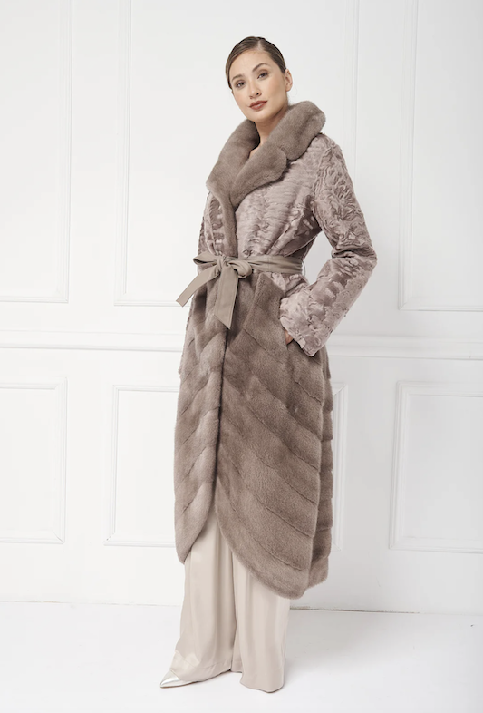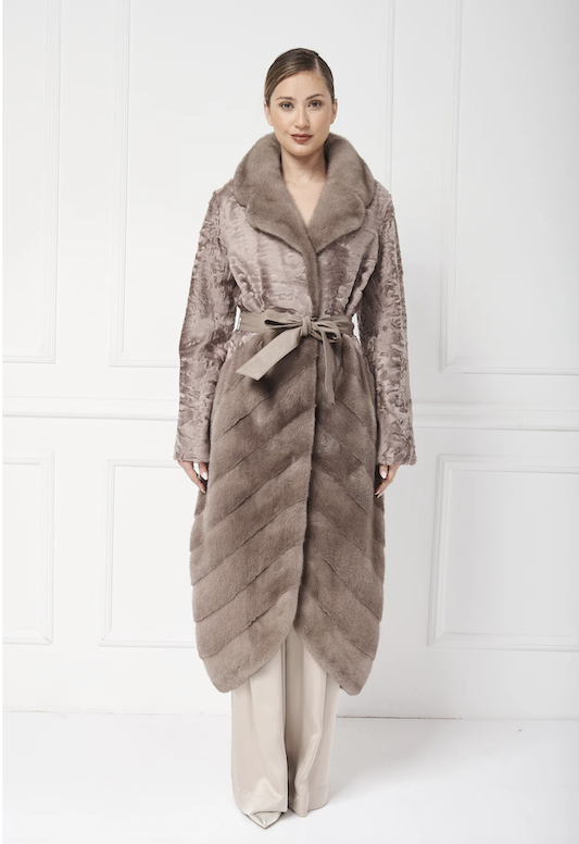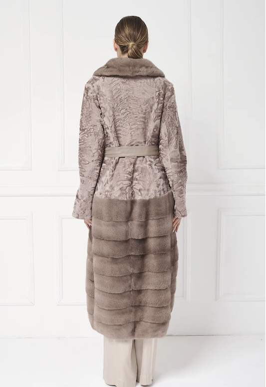 Kifinomult hosszú kabát, amelynek felső része és gallérja perzsa báránybőrből készült, míg az alsó része egyedi, átlós mintázatú nercből. A kabát elegáns, kerek szabással zárul, és tonális bőr övvel díszítve még kifinomultabbá teszi.