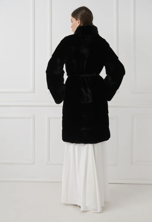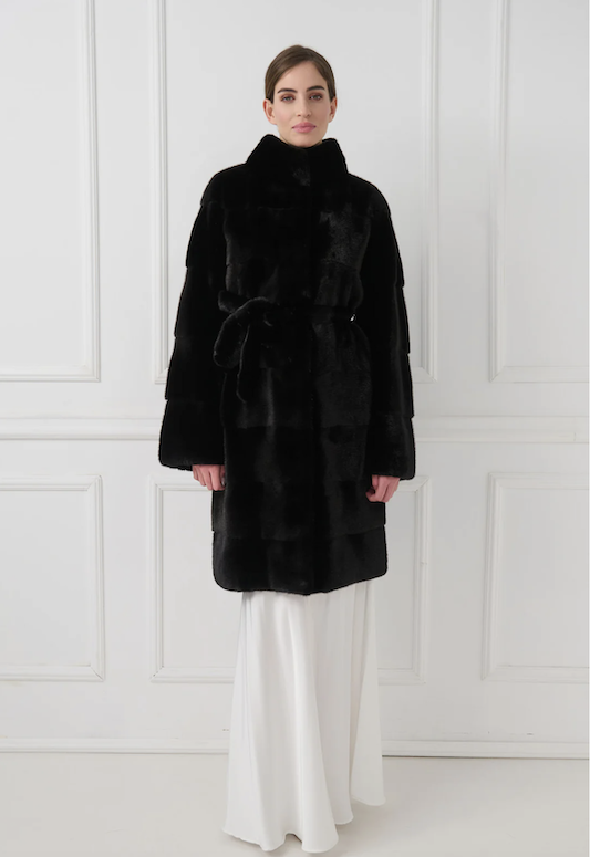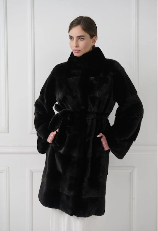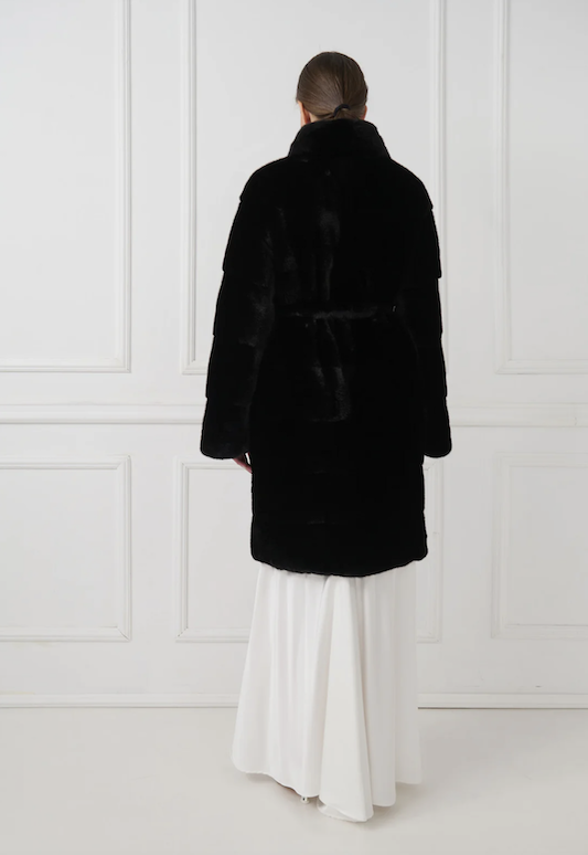 Elegáns és kifinomult nercbunda strukturált állógallérral és letisztult, egyenes vonalú sziluettel rendelkezik. Vízszintesen megmunkált minkbőrből készült, időtálló esztétikát képvisel.